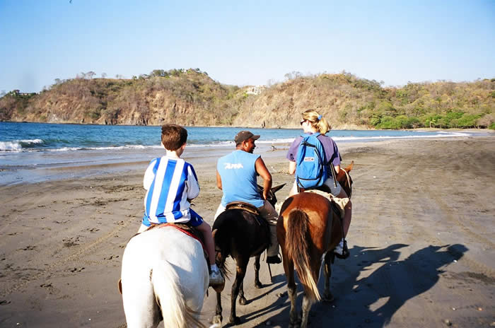 Our horseback guide showed up with four horses plus his own, which looked more like a donkey. This turned out to be one of the best experiences of the trip. We all mounted our horses – Grayson somehow was given the largest horse even though he had never ridden before! I guess he turned out to be one of the more gentle horses. We walked the horses up the road into the town of Flamingo and down the road that paralleled the beach -- then up a pretty big mountain. It was a little harrowing because it was a narrow road and cars were coming along fairly frequently. I was mainly nervous for the kids. We rode up the mountain and down through a beautiful valley. The views were stunning. We rode down through some beautiful land that looked like an orchard down to Playa Conchal which is one of the prettiest beaches. We walked the horses on the beach for a while and it was surreal - white sand, gorgeous blue water, and only a few people. Because it was so sparsely populated, our guide allowed us to run our horses. It was both terrifying and exhilarating. To see Darby and Grayson in front of me bouncing up and down on their horses as inexperienced as they are, while their horses galloped at full speed was the terrifying part. It was so exhilarating, though, to feel the wind on my face and take in all the wonderful sights, smells, and sounds.