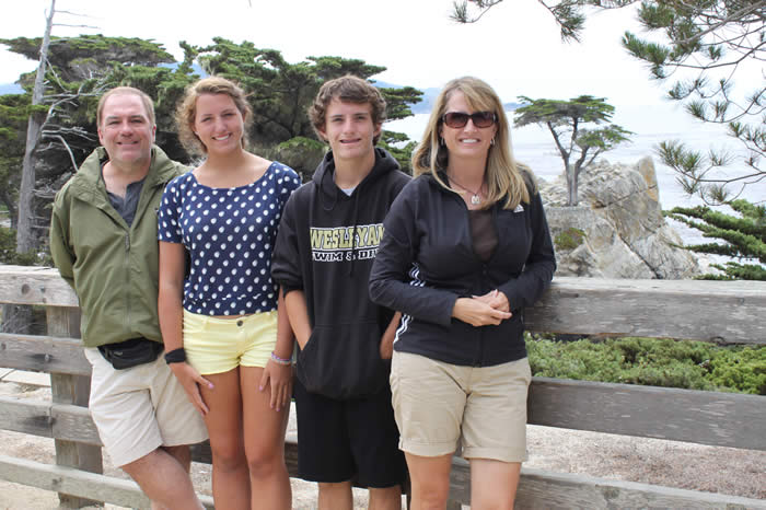 We arrived in Carmel about 10:30 and spent time exploring the darling seaside town and searching for the bench where Jonna and Mark were photographed in 1992 and then again on our honeymoon in 1994. Darby had the great idea to take another picture on the same bench and frame it with the other two which currently hang in our den at home. Mark pointed out several benches thinking they were the correct ones, but Jonna finally found the one where the photographs were taken so many years ago. Passers by surely thought we were crazy taking pictures on various benches to see if the backgrounds matched, but we finally succeeded in taking a 2012 update phot and this time, the kids were included!