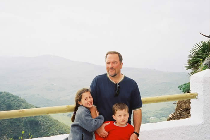 Mark and the kids posing by the church