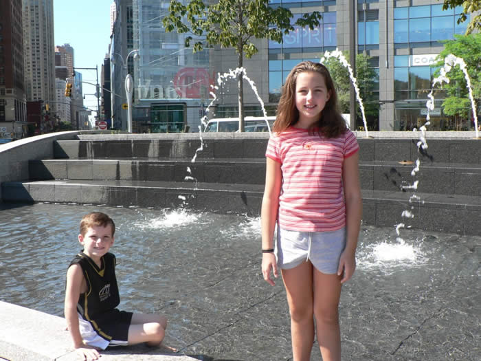 September 4, 2005 — We were afforded another beautiful day today - mid-70's and breezy. We walked up to Columbus Circle at 59th Street and the kids enjoyed playing in the fountain there. We decided to spend an easy Sunday in the sun and strolled through Central Park. It is so easy to get turned around in the park that we weren't quite sure where we were going. Darby was trying to locate the old-fashioned carousel she rode when she was up here in the spring and we finally located it. We all took a