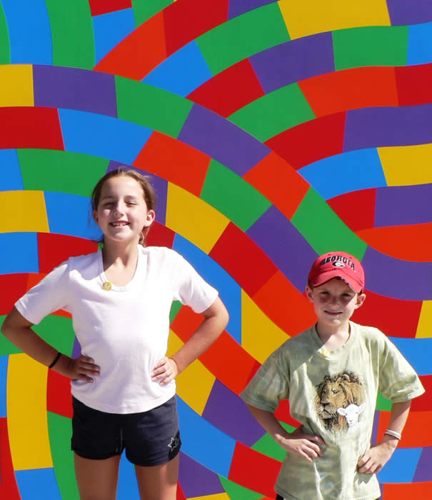 posed for a picture. From the park, we headed over to Fraunces Tavern at the corner of Pearl and Broad Streets. Fraunces Tavern was the site of General Washington's farewell speech to the officers in the Continental army after the Revolutionary War. The Sons of the Revolution have restored the tavern into a typical "tavern-type" restaurant downstairs and a museum on the two upper floors. They conduct a special hands-on Family Day activity the first Saturday of each month so the kids had the opportunity to paint a tavern style plaque. They both enjoyed the chance to get some paint on their hands! We meandered down Wall Street, appropriately named because the orignal settlers, the Dutch, had built a wall in that location to protect themselves from the Native Americans and the English. In that same area, we also saw the Federal Hall where Washington was inaugurated as the first president of the United States of America, and Trinity Church. It was amazing to see gravestones that are over 300 years old. We cabbed it up to Chelsea, made a brief pit stop at the hotel, and then ventured out again on foot toward the east side of the island to visit the United Nations building. The kids have been troopers with all the walking we have been doing and they are sleeping well at night! At the U.N. building, we took a very informative 1 hour tour. Our guide was a lady from Zimbabwe. It was very interesting to learn about all of the activities of the U.N. The kids were particularly interested in learning about the removal of landmines and they were fascinated with the fact that the U.N complex is an international (non-USA) property. There are 191 member nations and all activities of the U.N. are conducted in six major languages: English, Spanish, French, Chinese, Arabic, and Russian. We also sent a few postcards from the U.N. post office using stamps that are only valid for items mailed from the U.N. After our U.N. visit, the girls and boys split up. The girls headed to the American Girl Place - a mega, 4-story store that sells only American Girl dolls and items. Darby was in hog heaven! The boys headed to the ESPN Zone in Times Square to try to catch the UGA football game. Having no luck, they headed back to the hotel to see the game on TV. Darby and I enjoyed the next several hours shopping at the American Girl store and Barnes and Noble bookstore before meeting the boys back at the hotel where we found them watching the game. After the game (Dawgs beat Boise State 48-13), we headed out for some great NY Pizza, then called it a day.
