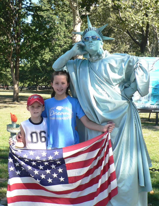 September 3, 2005 — The weather was outstanding again today! After a quick breakfast at the hotel, we boarded the subway for downtown. Once at Battery Park, we learned that tickets to tour the inside of the Statue of Liberty were not available this weekend. We decided to reserve tickets to tour both the Statue of Liberty and Ellis Island for Tuesday morning before we head to Washington DC. We enjoyed wandering and people watching in Battery Park. The kids found an "alternative" Statue of Liberty and