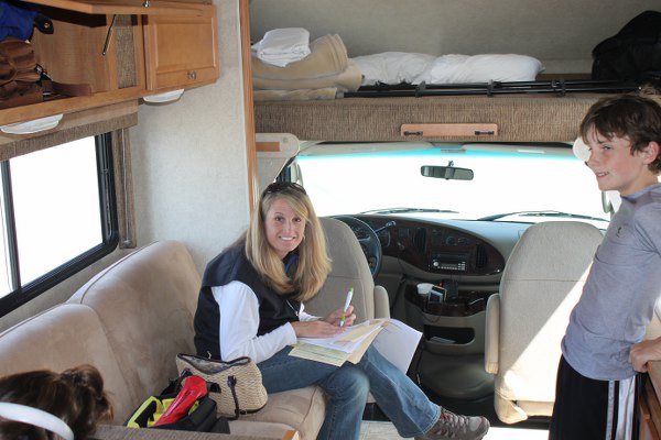 Jonna is working on the list of grocery items we need to pick up to stock the big rig!