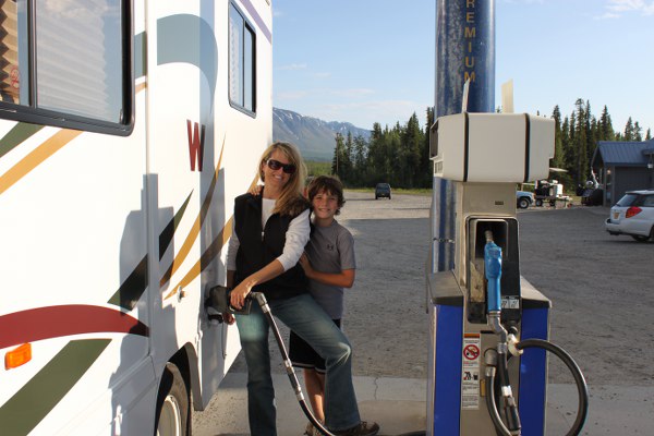 "Mountain girl" pumping gas into the big rig!