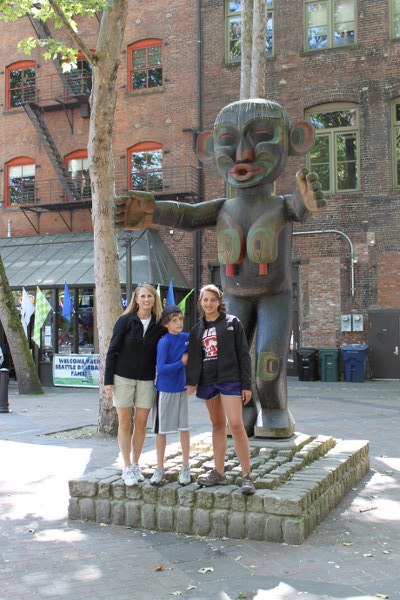 Darby and Grayson by the totem poles in Pioneer Square Park