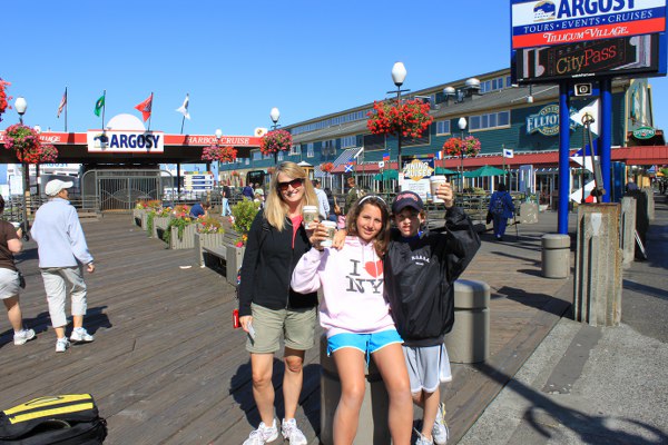 Jonna, Darby, and Grayson enjoying a Starbucks before boarding the boat