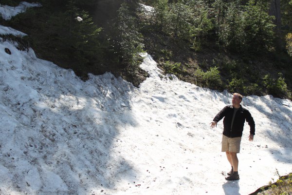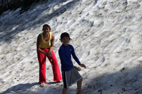 Darby (in flip flops and tank top!) and Grayson enjoy a snowball fight!