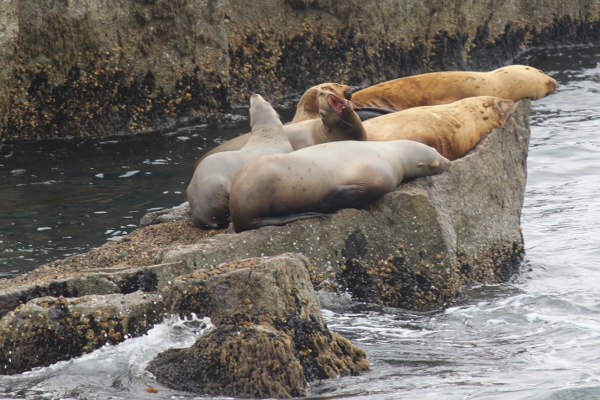 More Sea Lions relaxing on a rock - the golden ones are dry and the dark ones are wet